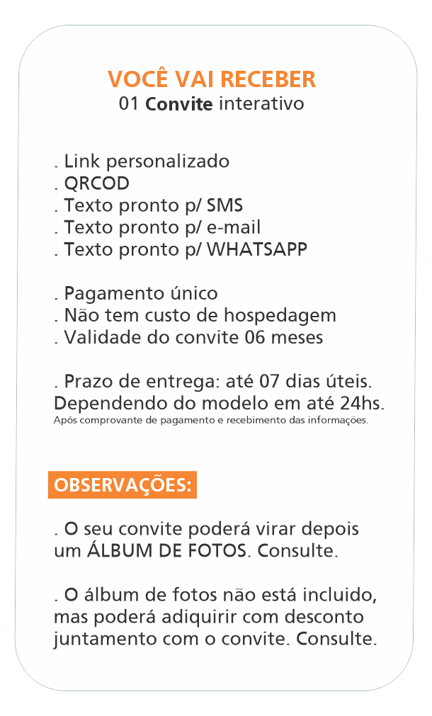 Após efetuar o pagamento, irá receber o contato da nossa equipe enviando o formulário de dados para preencher, após isso, o seu convite será confeccionado e irá receber: 01 CONVITE INTERATIVO pronto para uso, conforme modelo escolhido e dados enviados.